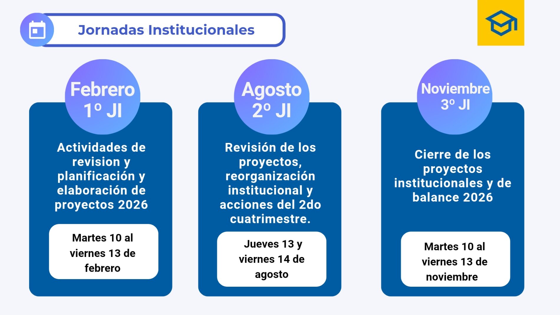Además, se definieron tres Jornadas Institucionales: febrero (planificación), agosto (revisión y reorganización) y noviembre (cierre y balance).